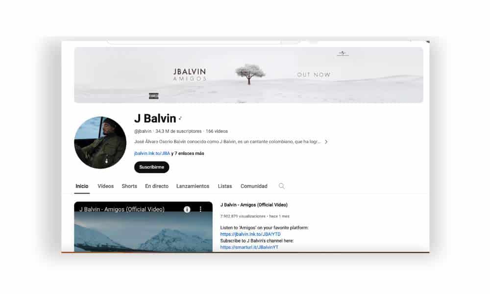 Encabezando este listado se encuentra uno de los artistas colombianos más famosos de los últimos tiempos, JBalvin, cuenta con 34,3 millones de suscriptores y 166 vídeos. Sus coloridos videoclips musicales destacan en su canal, con éxitos como «Mi Gente» y «Ginza» que registran más de mil millones de visualizaciones. J Balvin también comparte contenido variado como entrevistas, vlogs, conciertos en vivo y colaboraciones con otros artistas.