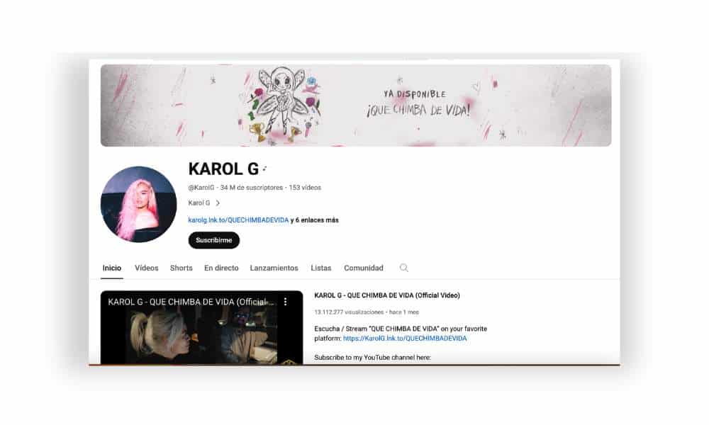 Una de las colombianas y latinas más famosas del momento, Carolina Giraldo, más conocida como Karol G. Es cantante, compositora y productora musical de reguetón y pop urbano. Su canal de YouTube, registra una asombrosa cifra de 34 millones de suscriptores y 153 videos, donde muestra contenido musical, material tras bastidores de su vida artística y eventos.